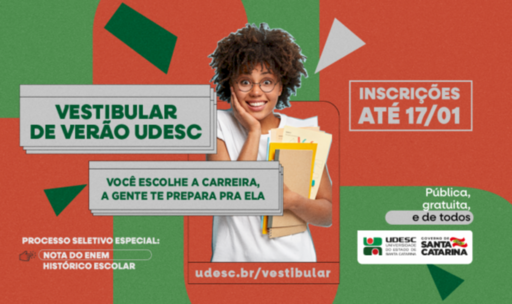 Até a próxima segunda-feira, 17, a Universidade do Estado de Santa Catarina (Udesc) ficará com inscrições gratuitas abertas para o Vestibular de Verão 2022, que será feito por processo seletivo especial, sem aplicação de provas. São oferecidas 1.275 vagas em 52 cursos de graduação presenciais e a distância em 12 municípios catarinenses. Acesse o edital, que tem todas as informações da seleção, e o formulário de inscrição em www.udesc.br/vestibular.