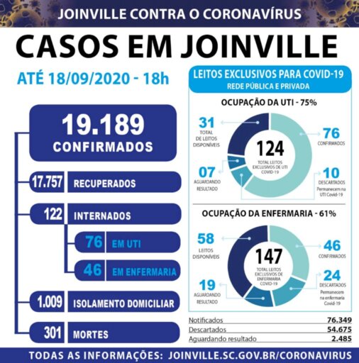 A semana se encerra com a confirmação de mais 144 casos positivos e total de 19.189 desde o início da pandemia. Os recuperados agora somam 17.757. Já foram realizados 76.349 exames, com 54.675 descartados e 2.485 aguardando resultado.Mais seis pessoas perderam a vida: um homem, de 67 anos, e cinco mulheres de 70, 86, 90 e duas de 75 anos. Com isso, Joinville soma 301 mortes no total.