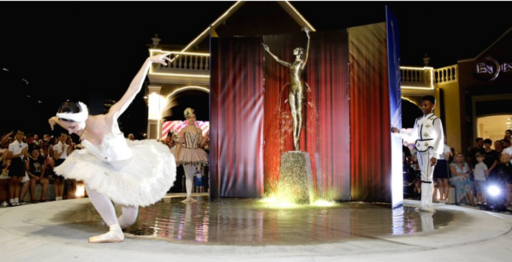 O grande destaque do espaço é o monumento da bailarina em tamanho real, instalado sobre um espelho d’água. A saia da escultura forma um chafariz iluminado, simbolizando a união entre arte e tecnologia que caracteriza a obra. A bailarina Thais Diógenes, modelo da peça, colaborou com o projeto ao posar por horas para o escaneamento tridimensional que deu forma ao monumento.