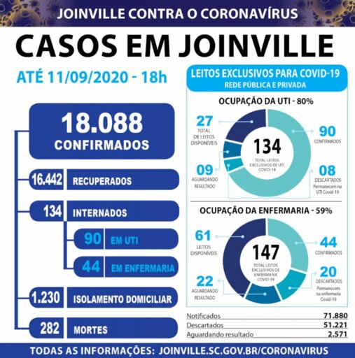 A semana se encerra com a confirmação de mais 331 casos positivos e total de 18.088 desde o início da pandemia. Os recuperados agora somam 16.442 e 282 perderam a vida. Já foram realizados 71.880 exames, com 51.221 descartados e 2.571 aguardando resultado.Mais três pessoas perderam a vida, todos homens, de 67 69 e 82 anos.O Painel COVID-19 é atualizado diariamente, às 18h, com o número total de leitos de UTI, incluindo os neonatais e pediátricos. O painel também informa a ocupação de leitos de UTI geral (não Covid-19), dos hospitais públicos e privados. O Painel COVID-19 Joinville pode ser acessado no site: