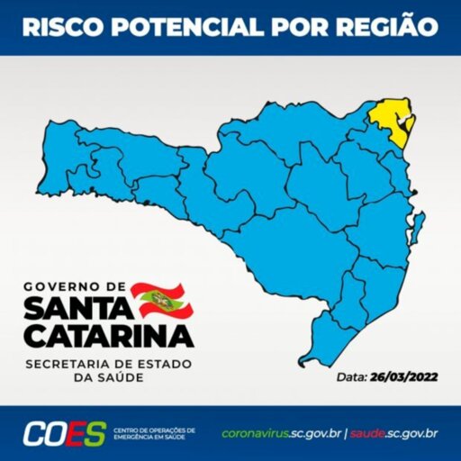 ?A matriz de risco potencial regionalizado divulgada neste sábado, 26, aponta 16 regiões classificadas no nível Moderado (cor azul): Alto Uruguai Catarinense, Alto Vale do Itajaí, Alto Vale do Rio do Peixe, Carbonífera, Extremo Oeste, Extremo Sul Catarinense, Foz do Rio Itajaí, Grande Florianópolis, Laguna, Médio Vale do Itajaí,  Meio Oeste, Oeste, Planalto Norte, Serra Catarinense, Vale do Itapocu e Xanxerê, e apenas uma região no nível Alto (cor amarela): Nordeste.