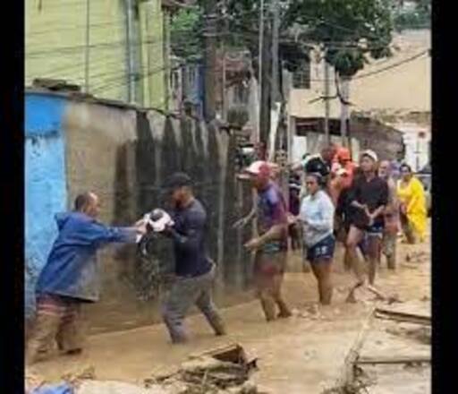 No vídeo, que circula nas redes sociais, é possível ver a rua tomada pela lama enquanto os moradores passm o bebê de braço em braço até que ele fique em local seguro. Na sequência, outra criança também é resgatada.