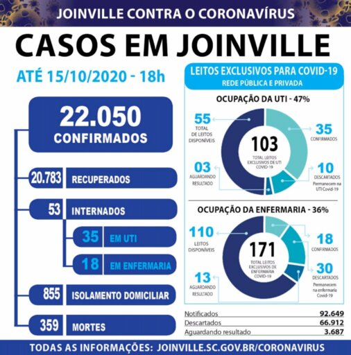 Em novo boletim nesta quinta-feira (15/10), a Secretaria da Saúde de Joinville confirmou 22.050 no total de casos de coronavírus desde o início da pandemia. Os recuperados agora somam 20.783 e, dos confirmados, 53 estão internados, 855 em isolamento domiciliar e 359 perderam a vida. Já foram realizados 92.649 exames, com 66.912 descartados e 3.687 aguardando exame.Foram confirmadas mais quatro mortes: duas mulheres, de 68 e 72 anos, e dois homens, de 38 e 86 anos.