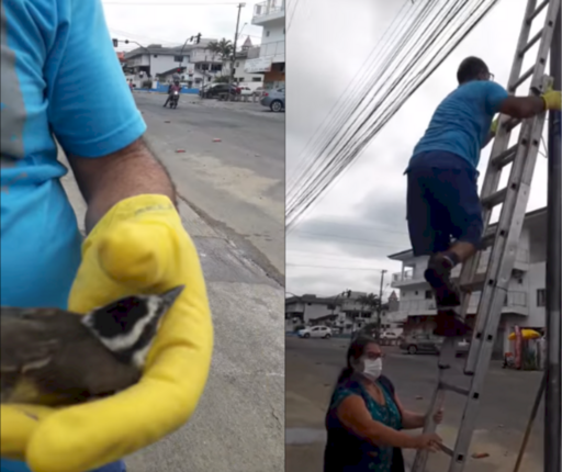 Olivia, a zeladora da Unidade de Saúde teve sua atenção despertada pelos altos e repetitivos gritos de um casal de bem-te-vis pousados no ponto mais alto do poste. Olivia interpretou a gritaria como um pedido de socorro e resolveu chegar mais perto do poste que fica bem próximo à sede da Unidade de Saúde e constatou que havia lá um ninho. Olhando mais detidamente, descobriu o motivo da gritaria. Um filhote havia caído do ninho e estava preso entre fios.