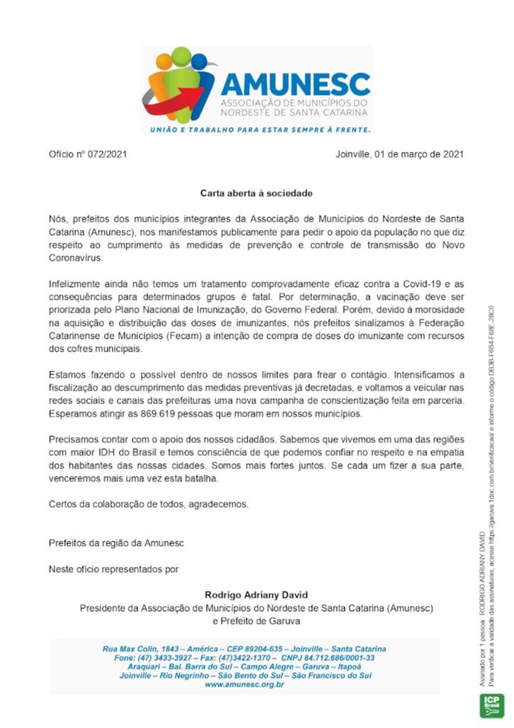 No ofício, os gestores explicam que intensificaram a fiscalização ao descumprimento de medidas e afirmam que estão buscando alternativas para ampliar a vacinação, com a intenção de compra de novas doses já formalizada junto à Federação Catarinense de Municípios (Fecam). Além da carta aberta à sociedade, os prefeitos também enviaram ofício ao Governo do Estado e à Fecam, manifestando preocupação com relação às medidas mais restritivas, como o lockdown.