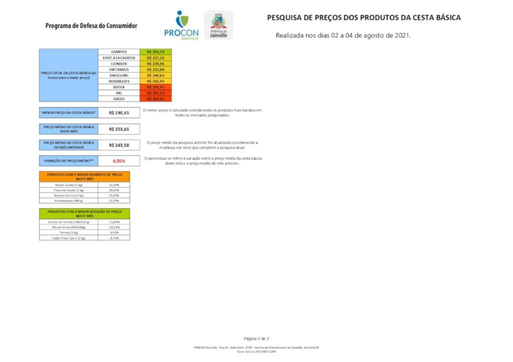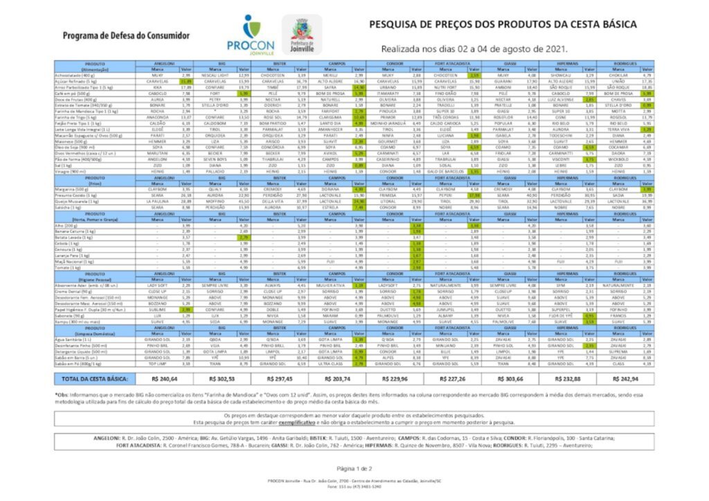 A pesquisa de preços da cesta básica de agosto em Joinville já está disponível para consulta. O levantamento foi feito em nove mercados em diferentes bairros da cidade. Houve um aumento de preço da cesta básica de 4,05% em relação a julho passado. O valor médio atualmente é de R$ 253,45.