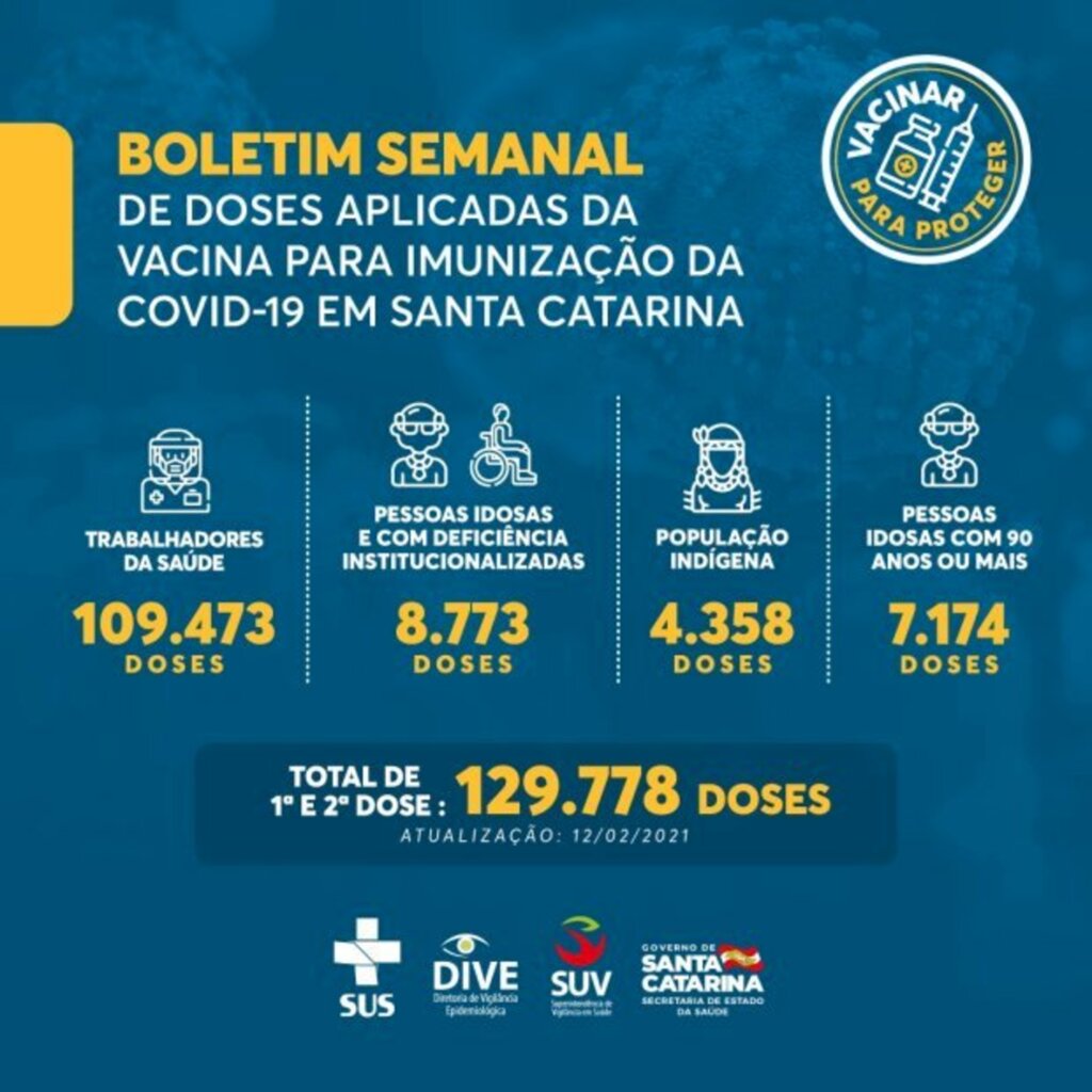 O número total de doses aplicadas em Santa Catarina da vacina contra a Covid-19 é de 129.778. O número está foi divulgado pelo balanço parcial de vacinação divulgado pela Diretoria de Vigilância Epidemiológica de Santa Catarina (Dive), da Secretaria de Estado da Saúde (SES), nesta sexta, 12. Sendo que 118.646 foram primeira dose (D1) e 11.132 segunda dose (D2).