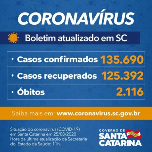 Santa Catarina chegou a 135.690 pacientes com teste positivo para Covid-19. Desses, 125.392 são considerados recuperados e 8.182 continuam em acompanhamento. O número foi divulgado nesta terça-feira, 25. Desde o início da pandemia, 2.116 óbitos foram causados pelo coronavírus. A taxa de letalidade é de 1,56%. Casos de infecção pelo novo coronavírus já foram confirmados em todos os 295 municípios de Santa Catarina e 203 têm registro de ao menos um óbito. O local com a maior quantidade de pessoas que já contraíram Covid-19 é Joinville, que soma 11.468 casos. Em seguida, estão Blumenau (7.971), Balneário Camboriú (5.541), Florianópolis (5.299), Chapecó (5.039), Itajaí (4.858), Criciúma (4.510), Brusque (4.022), São José (3.754) e Palhoça (3.742). A taxa de ocupação dos leitos de UTI pelo Sistema Único de Saúde (SUS) em Santa Catarina é de 71,9%. Isso significa que, dos 1.494 leitos existentes no estado, 420 estão livres e 1.074 estão ocupados, sendo 471 por pacientes com confirmação ou suspeita de Covid-19.