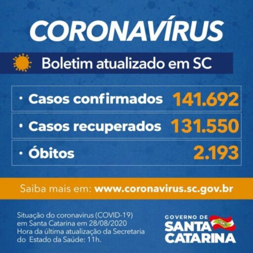 Santa Catarina tem 141.692 casos confirmados de Covid-19, dos quais 131.550 estão recuperados e 7.949 permanecem em acompanhamento. O dado foi divulgado nesta sexta-feira, 28. Desde o início da pandemia, 2.193 óbitos foram causados pelo coronavírus. Esses números colocam a taxa de letalidade em 1,55%. As 295 cidades catarinenses têm casos confirmados, e 205 registraram ao menos um óbito. A cidade com a maior quantidade de confirmações de infecção pelo novo coronavírus é Joinville, que contabiliza 12.280 casos, seguida por Blumenau (8.446), Balneário Camboriú (5.628), Florianópolis (5.383), Chapecó (5.142), Itajaí (4.933), Criciúma (4.702), Brusque (4.176), Palhoça (3.908) e São José (3.867). Atualmente, há 1.497 leitos pelo Sistema Único de Saúde (SUS) em todo o estado, dos quais 1.059 estão ocupados, sendo 430 por pacientes com confirmação ou suspeita de infecção por coronavírus. A taxa de ocupação geral é de 70,7% e há 438 leitos livres atualmente.