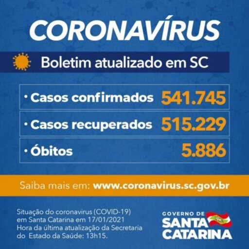 Santa Catarina chegou a 541.745 casos confirmados de infecção pelo novo coronavírus. Desses, 515.229 são considerados recuperados e 20.630 continuam em acompanhamento. O número foi divulgado neste domingo, 17. Desde o início da pandemia, 5.886 mortes foram causadas pela Covid-19. A taxa de letalidade é de 1,09%.