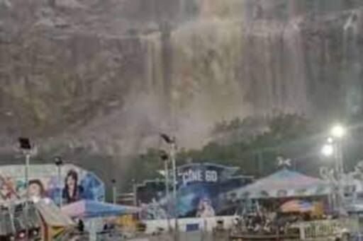 Na filmagem, é possível ver o momento em que uma rocha se solta do maciço devido à força da água. Um parque de diversões que fica próximo do local não foi danificado.