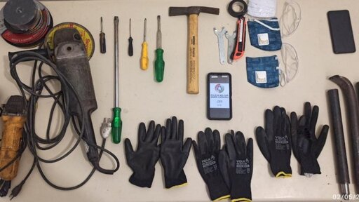 No interior da lotérica foram localizados os instrumentos utilizados para o crime. Sendo apreendidos um celular, um rolo de extensão, um martelo, duas chaves de apertar disco, um estilete, três pares de luvas, cinco chaves de fenda e duas lixadeiras. Quando realizada a consulta dos nomes dos abordados, foi constatado que o homem de 32 anos possuía mandado de prisão ativo. Os homens foram encaminhados à delegacia de Polícia Civil, juntamente com o material apreendido.