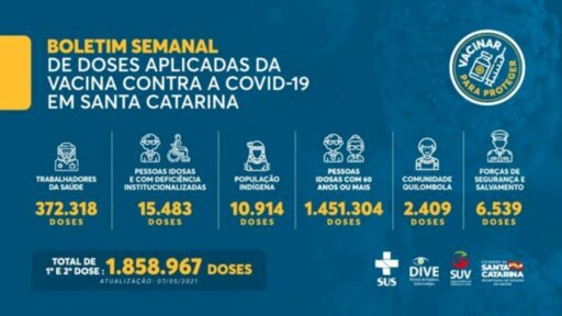 Os dados são do Balanço Parcial de Vacinação contra a Covid-19 divulgado pela Secretaria de Estado da Saúde. Os dados são fornecidos pelos municípios catarinenses e compilados pela Diretoria de Vigilância Epidemiológica (Dive).