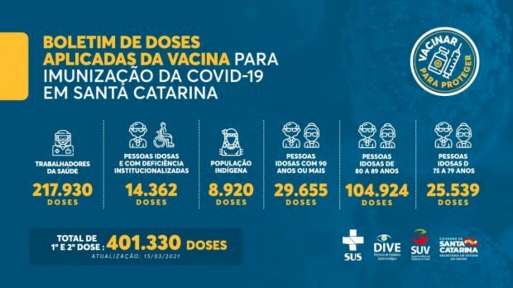 Do total, 302.616 correspondem à primeira dose (D1) e 98.714 à segunda (D2). O balanço é elaborado pela Diretoria de Vigilância Epidemiológica (Dive) com informações fornecidas pelos municípios catarinenses. Os grupos prioritários que estão sendo vacinados neste momento são: os trabalhadores da saúde, os idosos e as pessoas com deficiência institucionalizados, a população indígena e os idosos com 75 anos ou mais. O estado aguarda o envio de novas doses para ampliar a vacinação para outros grupos prioritários