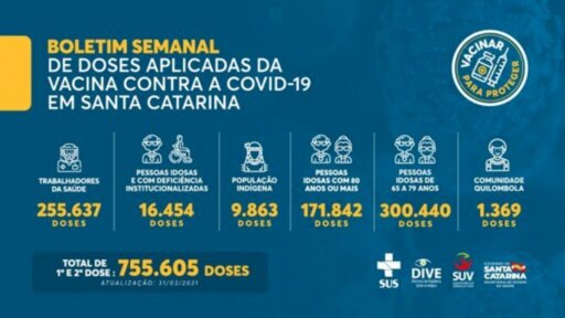 Santa Catarina aplicou mais 54.994 doses da vacina contra a Covid-19 nos grupos prioritários, em um comparativo com o boletim divulgado na segunda-feira, 29, e soma 755.605 doses aplicadas desde o início da Campanha de Vacinação. Os dados são do Balanço Parcial de Vacinação contra a Covid-19 divulgado nesta quarta, 31, pela Secretaria de Saúde de Santa Catarina. Do total de doses aplicadas, 608.970 correspondem à primeira dose 1 (D1) e 146.635 à segunda 2 (D2).o Balanço desta quarta está disponível o quantitativo de doses aplicado nos seguintes grupos prioritários: trabalhadores da saúde, idosos e pessoas com deficiência institucionalizados, população indígena, quilombolas e idosos com 65 anos ou mais.Os dados do Balanço são fornecidos pelos municípios catarinenses e compilados pela Diretoria de Vigilância Epidemiológica (Dive).
