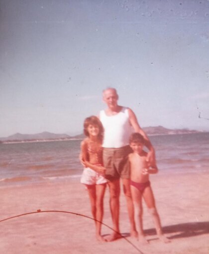 • Foto cedida por Maria Fernanda, neta de Etelvino. - Na praia de Ponta das Canas em Florianópolis, Etelvino Silveira de Souza com o neto Laerte Clóvis de Souza Filho e a menina Elizabete