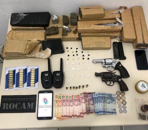 Em conversa com o agente acerca da procedência da denúncia, o mesmo relatou que a droga e as armas estariam no apartamento que mora, em ato contínuo policiais deslocaram-se até o apartamento onde foi localizada em baixo da cama 18 tabletes de maconha, 8 fragmentos de maconha sem embalar, 18 pedras de crack, 16 buchas de cocaína, 30 munições de .40, 1 carregador de pistola .380, 1 carregador de pistola .40, 1 munição 9mm, 6 munições de .38, 150 reais, 2 revólveres calibre .38. Diante dos fatos, todo o material encontrado em sua residência e o casal foram levados a Delegacia de Polícia para as providências cabíveis.