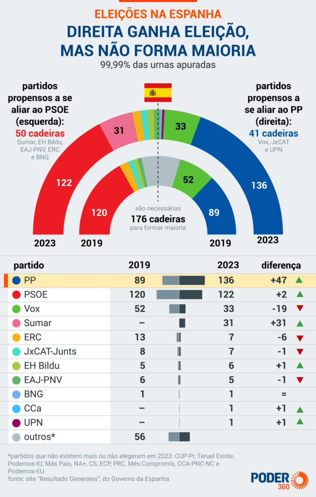 As recentes eleições gerais na Espanha resultaram na vitória do Partido Popular (PP), liderado por Alberto Núñes Feijóo, embora não tenha garantido uma maioria para a formação de governo. O pleito, ocorrido em 23 de julho, distribuiu as 350 cadeiras do Congresso dos Deputados e 208 das 265 cadeiras do Senado. No sistema parlamentar espanhol, os eleitores votam nas legendas, sendo a distribuição de cadeiras baseada na proporção de votos obtidos por cada partido. Os senadores, por sua vez, são os únicos eleitos por voto direto.