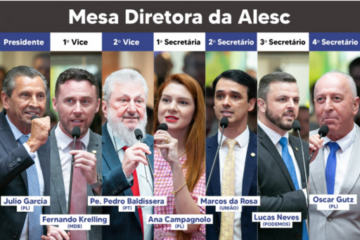 Com 38 votos favoráveis e duas ausências, a nova Mesa Diretora do Parlamento catarinense será composta pelos parlamentares: Fernando Krelling (MDB) como 1º vice-presidente, Padre Pedro Baldissera (PT) 2º vice-presidente, Ana Campagnolo (PL) 1ª secretária, Marcos da Rosa (União) 2º secretário, Lucas Neves (Podemos) 3º secretário e Oscar Gutz (PL) 4º secretário.