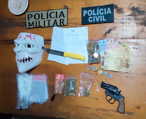 Foram localizados porções de droga, embalagens para o acondicionamento do entorpecente para posterior venda, aproximadamente mil reais em espécie, um simulacro de arma de fogo e uma máscara, estes dois últimos itens a serem apurados se foram usados para o cometimento do crime de roubo.